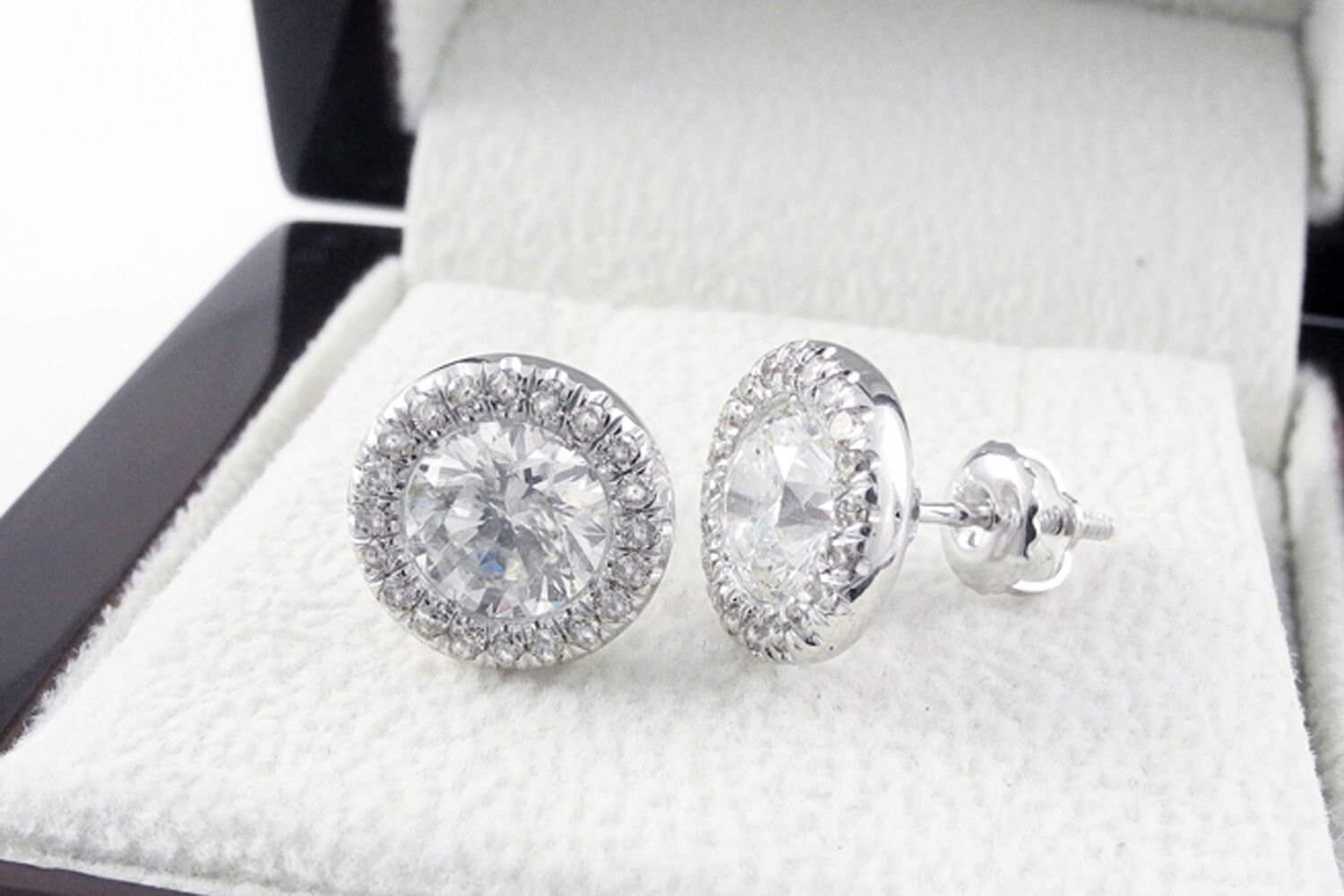 These beautiful Pave Diamond Earrings are made in 14k white gold and set in the center with a natural earth-mined round diamond of 0.30 Ct (0.60 Ct) and graded H SI1 (Clarity Enhanced).